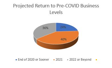 When polled regarding when business conditions will recover to pre-Covid-19 levels, nearly a quarter of CEOs said that business conditions never declined, have recovered, or will likely recover by the end of the year. However, Forty percent said they expect business conditions to recover in 2021, and 36% said they expect business conditions to recover in 2022 or later.
